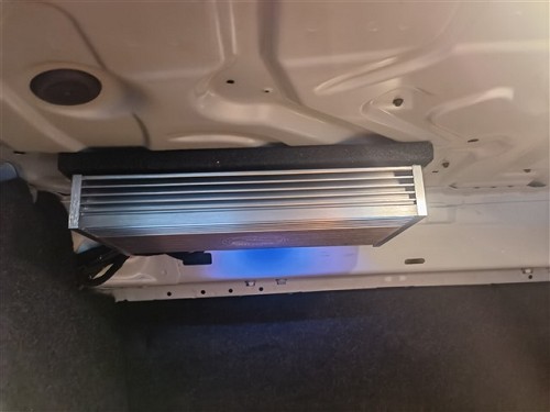 之后,技師采用尾箱頂部吊裝的安裝方式,為汽車添加了一臺詩芬尼BO10 DSP功放,8路大功率輸出動力源源不斷,并且具有優化音源,和調音功能,可以輸出高品質的音頻信號,并營造出立體環繞的聽覺體驗。