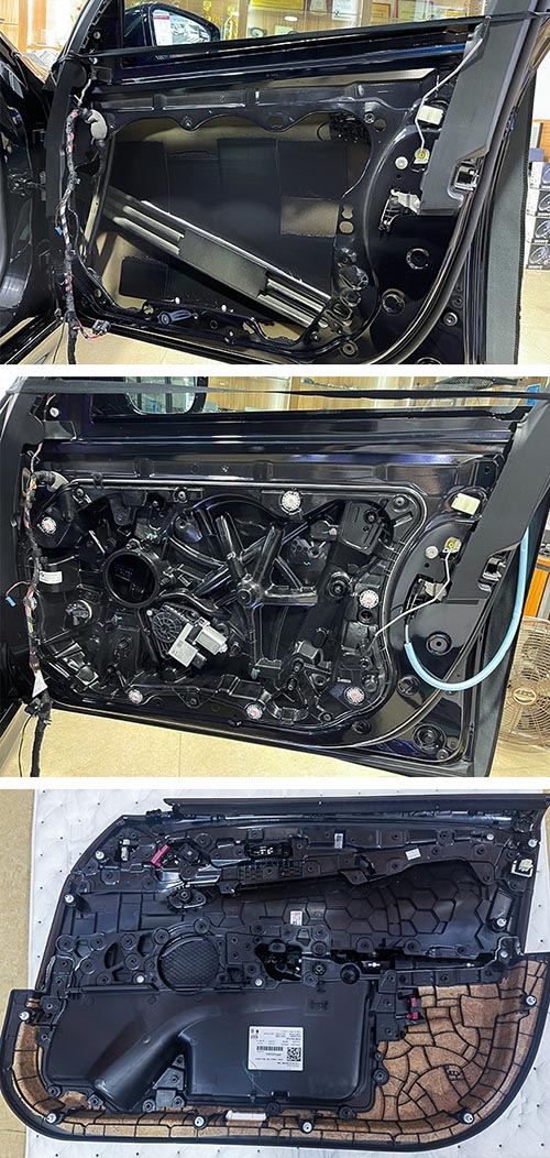 汽車的車門是一個(gè)隔音不可少的部位,車輛高速行駛時(shí)產(chǎn)生的路噪,風(fēng)噪和共振產(chǎn)生的噪音都會(huì)通過薄弱的車門鈑金進(jìn)入車廂內(nèi)部。當(dāng)聲音傳入車內(nèi)時(shí),如沒有吸音和隔音材料來吸收和阻隔,噪音就會(huì)不斷折射和重疊。所以隔音第一部位處理就是車門。