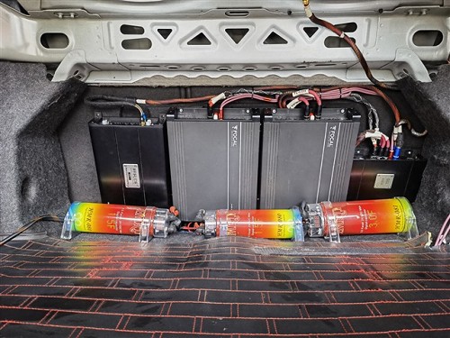 兩臺法國勁浪AP4340功放驅(qū)動前聲場6只喇叭,做主動分頻;尾箱安裝兩只法國勁浪SUB 30A4箱體低音炮,用兩臺弗萊德FD—1D功放來驅(qū)動,有精準(zhǔn)的低頻控制力,大體積低音下潛深度充沛而且彈性十足,非常震撼。通過合理的安裝布局,器材雖多,但絲毫不會有雜亂的感覺。