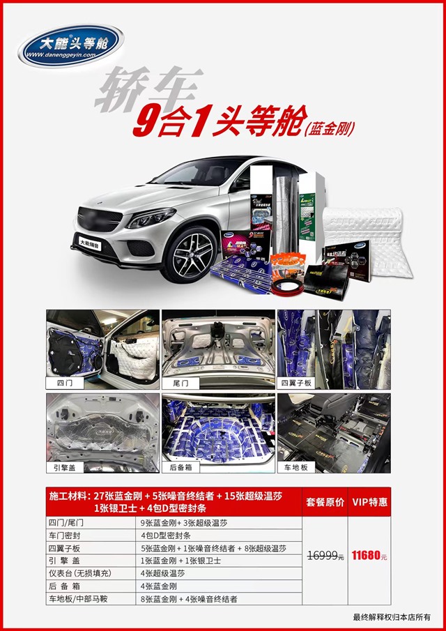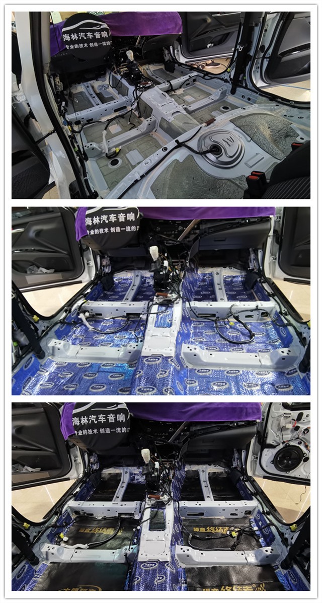 低頻噪音、發動機噪音、輪胎噪音通過底盤表現出來具有很強的穿透性,是汽車噪音最主要的表現形式,也是影響汽車駕駛舒適性的主要原因。所以改裝師在底盤貼上大能藍金剛和噪音終結者,重點解決發動機噪音和路噪,有效抑制共振,降低大量的發動機和排氣管熱量向駕駛室傳導。