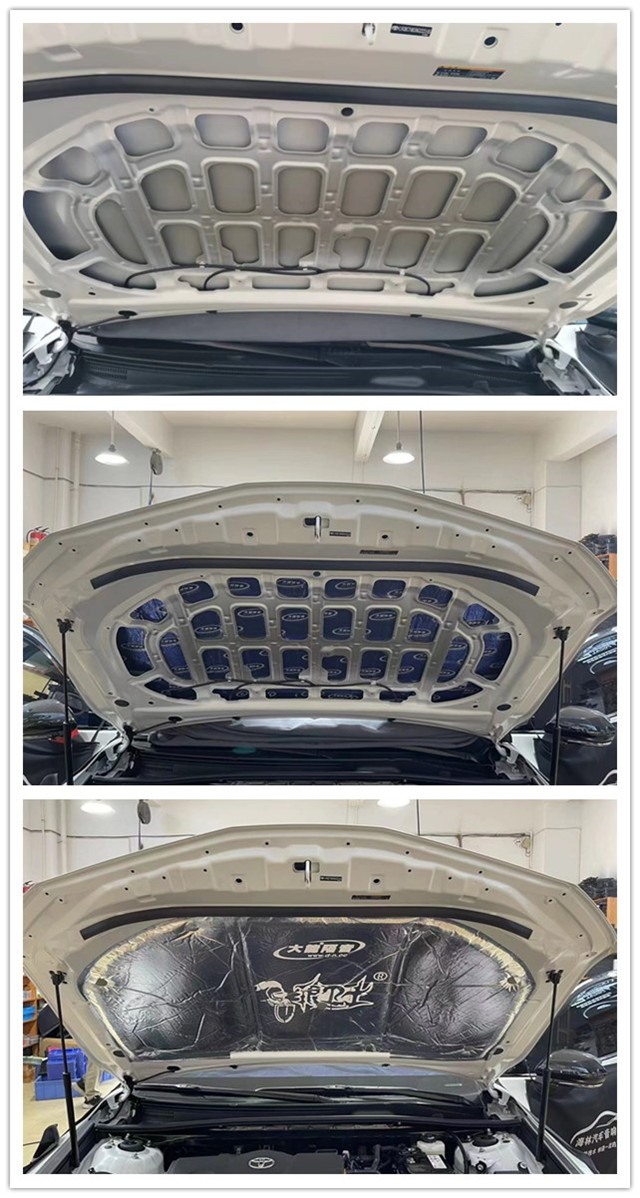我們的汽車引擎蓋是離發動機的距離最近的,發動機工作時就會不斷引起周邊金屬的振動,然后將噪音進行傳遞,熱量的產生也會對引擎蓋進行烘烤,導致漆面老舊,影響漆面的美觀。所以改裝師使用大能藍金剛做第一層止振的基礎,再貼上銀衛士作為第二層,有了銀衛士的加入,讓隔音隔熱產生立竿見影的效果。