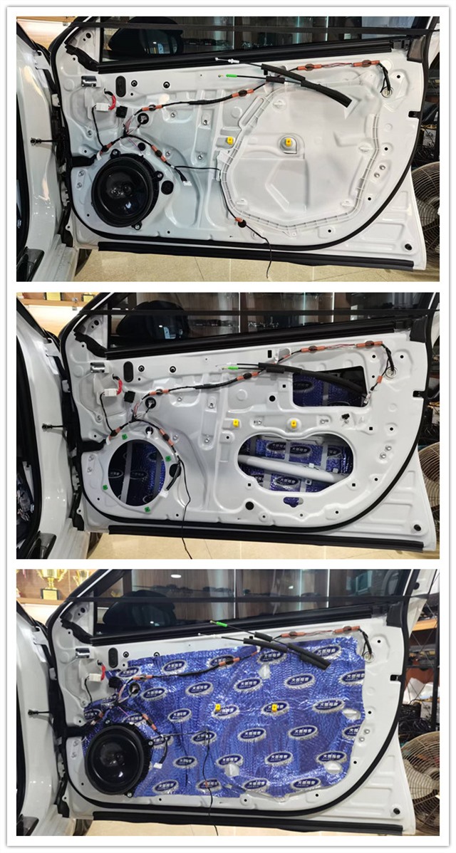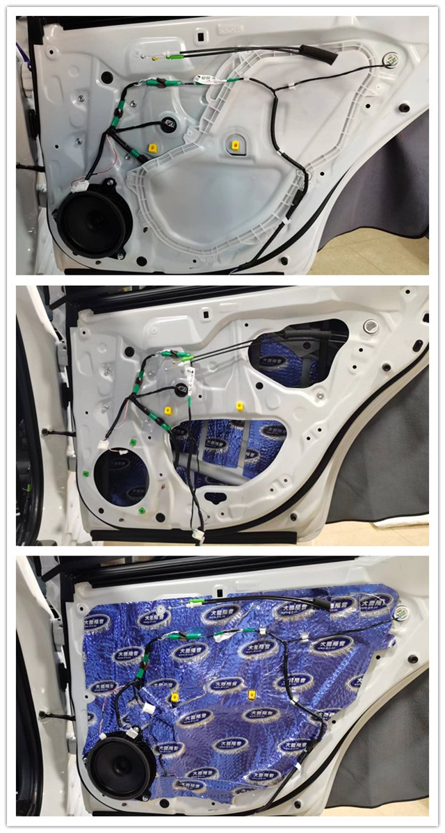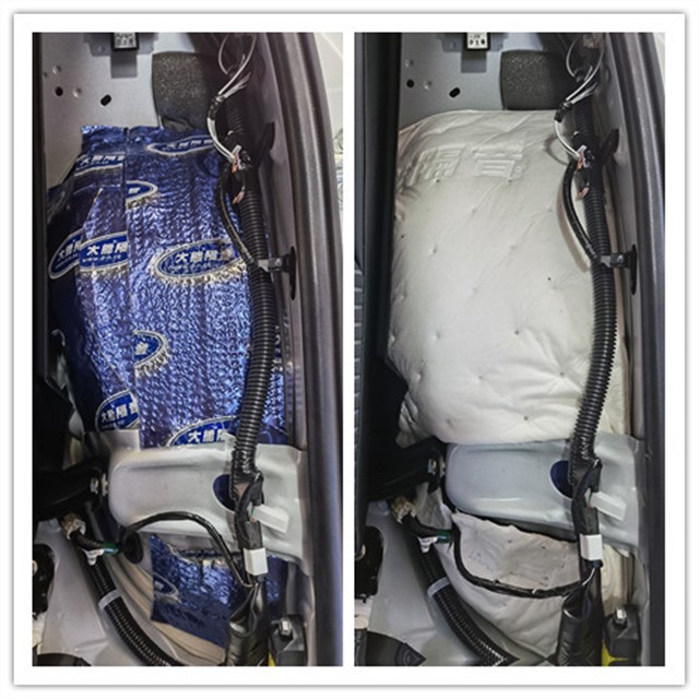 門板是風噪的主要傳播途徑之一,但原車的門板鐵皮結構單薄,內部的空洞結構較多,汽車在行駛時候產生的風噪很容易通過門板傳入到車廂的內部,因此使用大能藍金剛對門板做了隔音止震處理,有效降低風噪的傳入,以及抑制鈑金共振。并且還使用超級溫莎對門板飾蓋進行填充,使整體的隔音效果更佳。