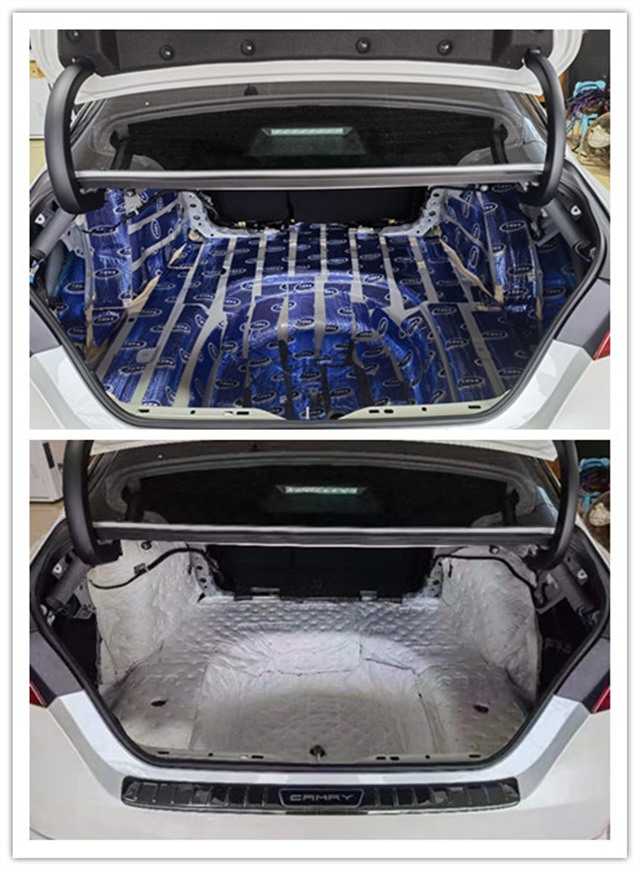 由于尾箱是后輪轂噪音和排氣噪音的主要通道,通過尾箱會傳入大量的噪音及燥熱。而豐田凱美瑞的原車尾箱沒有任何的隔音處理,薄弱的鈑金更容易將噪音傳遞到駕駛室,長時間的震動也會導致尾箱的鈑金強度下降,所以使用大能藍金剛進行第一層止震處理,將材料均勻地粘貼在鈑金表面,增加鈑金厚度,抑制鈑金振動,最后使用超級溫莎,吸收尾箱及輪轂部分的各類高頻噪音。