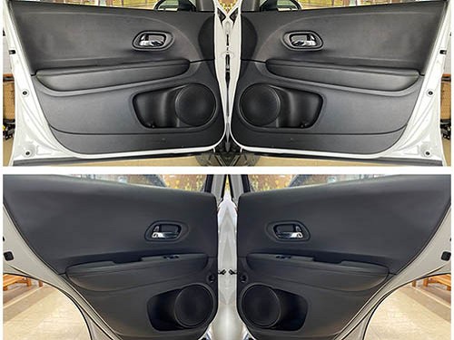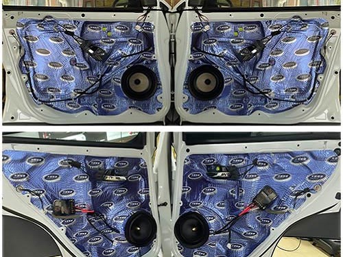 在改裝之前,我們用大能藍金鋼為車門進行四門雙層隔音。因為在行車途中,車內(nèi)外環(huán)境的繁復(fù)變化無疑是純凈音效的巨大挑戰(zhàn),而音響改裝前期的車門雙層隔音則可以防止車門共振,加固車門結(jié)構(gòu),增強車門的密封性等,為喇叭營造一個出色的環(huán)境。前聲場則安裝一套FOCAL PS 165 FXE兩分頻。