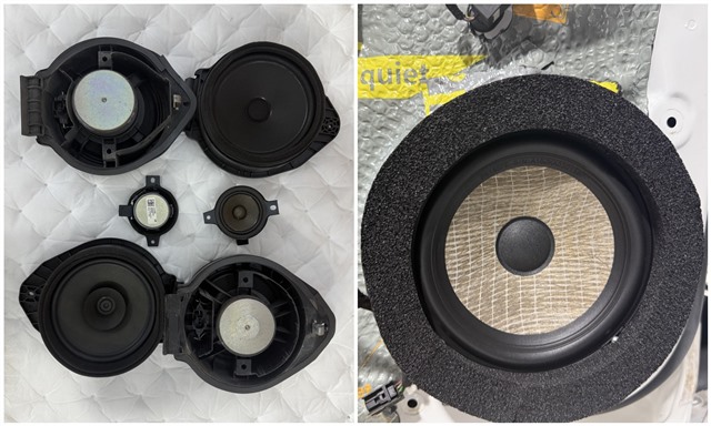 施工前,師傅對(duì)車內(nèi)飾進(jìn)行了全面保護(hù),避免在操作過(guò)程中劃傷或污染內(nèi)飾部件。并且把原車?yán)炔鹦断聛?lái),可以看到原裝喇叭沒(méi)有任何保護(hù)措施,其背部已經(jīng)微微泛黃,我們用勁浪中低音單元替換原車門喇叭后在前后聲場(chǎng)的喇叭均加裝防水墊圈,避免水分侵蝕。原車?yán)扰c勁浪喇叭的對(duì)比清晰可見——后者材質(zhì)和工藝明顯更優(yōu)。