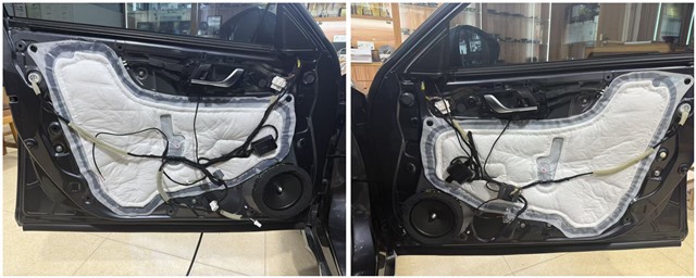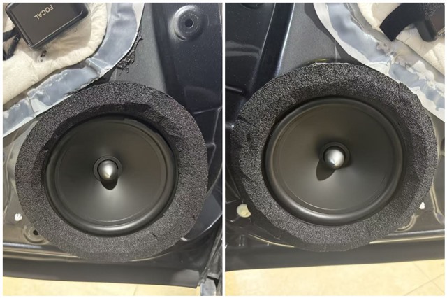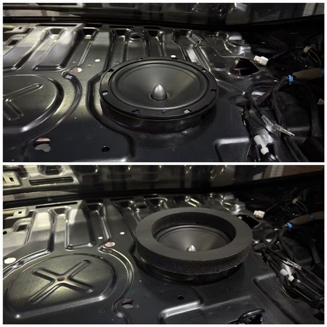 安裝完高音后,為前門板原位無損安裝了勁浪ASE-165的中低音喇叭。安裝過程中,特別為每只喇叭加裝了美音圈,能防止聲音向四周擴散,使聲音集中向前發出,達到更好效果,讓車門形成一個理想的音箱腔體,提升中低頻的力度和彈性。