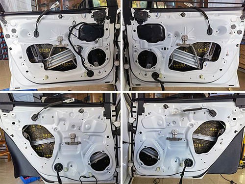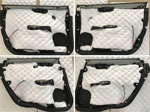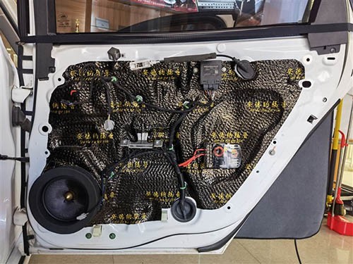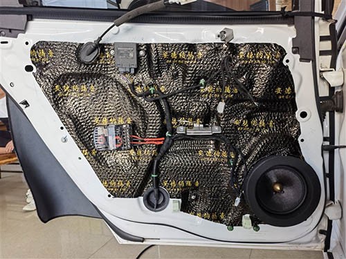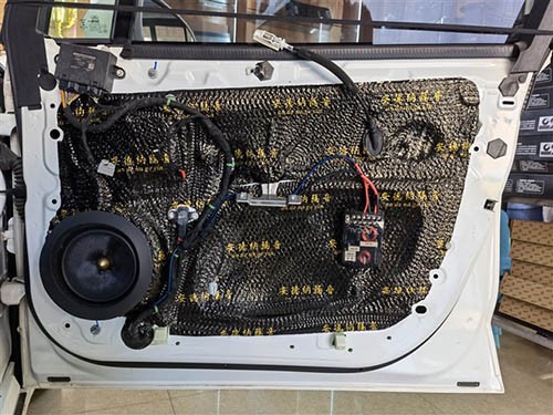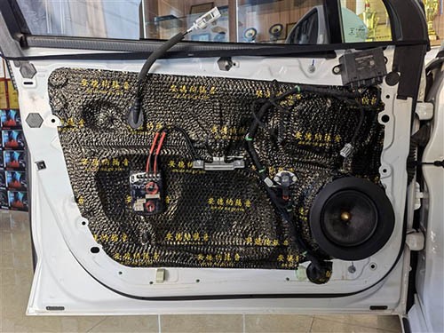 原車門板隔音措施較為簡單,風(fēng)噪很容易通過門板傳入到車廂內(nèi)部。因此改裝技師使用安德納+吸音棉,對門板及飾蓋做了三層的隔音處理。這就像是為聲場喇叭制作了一個(gè)密封的箱體一般,有效阻止了風(fēng)噪的傳入,為聲場喇叭創(chuàng)造了一個(gè)良好的工作環(huán)境。