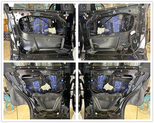 先是使用大能藍(lán)金剛進(jìn)行前后門板內(nèi)部的第一層隔音,減少門板鈑金之間產(chǎn)生的共振