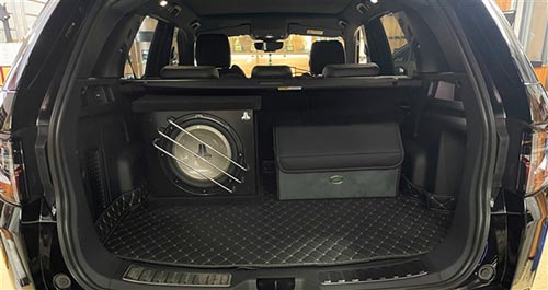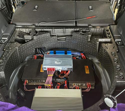 功放及音源處理器整齊有序地接線安裝在備胎處,不會(huì)占用過多的儲(chǔ)物空間