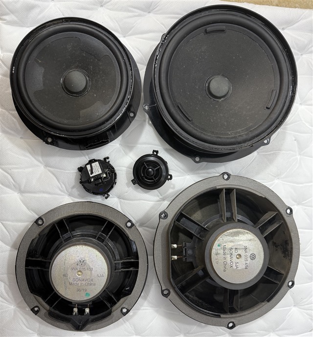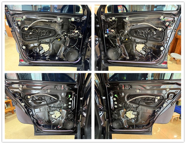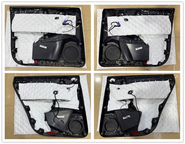 拆卸原車門板后,可以看到原車喇叭做工粗糙,音盆薄弱,磁鋼尺寸小,聲音干癟無力。門板毫無隔音處理,導致外部噪音直接進入車廂,同時喇叭聲波在門腔內雜亂反射,嚴重影響音質表現。