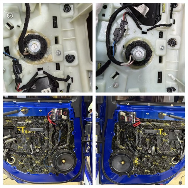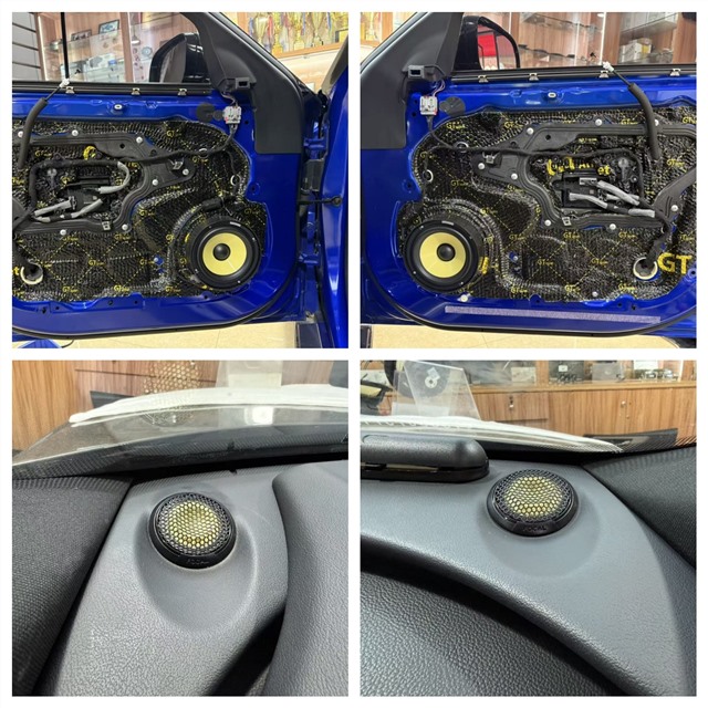 前聲場選用法國勁浪ES165K兩分頻,這套源自法國的音響利器搭載凱夫拉纖維振膜,兼具輕量化與剛性優勢,能精準還原動態細節。技師將高音單元原位嵌入儀表臺兩側,與原車內飾無縫融合;中低音則在門板完成GT雙層隔音后安裝——內層止振墊抑制鈑金共振,外層密封形成密閉音腔,為喇叭搭建穩定發聲環境。