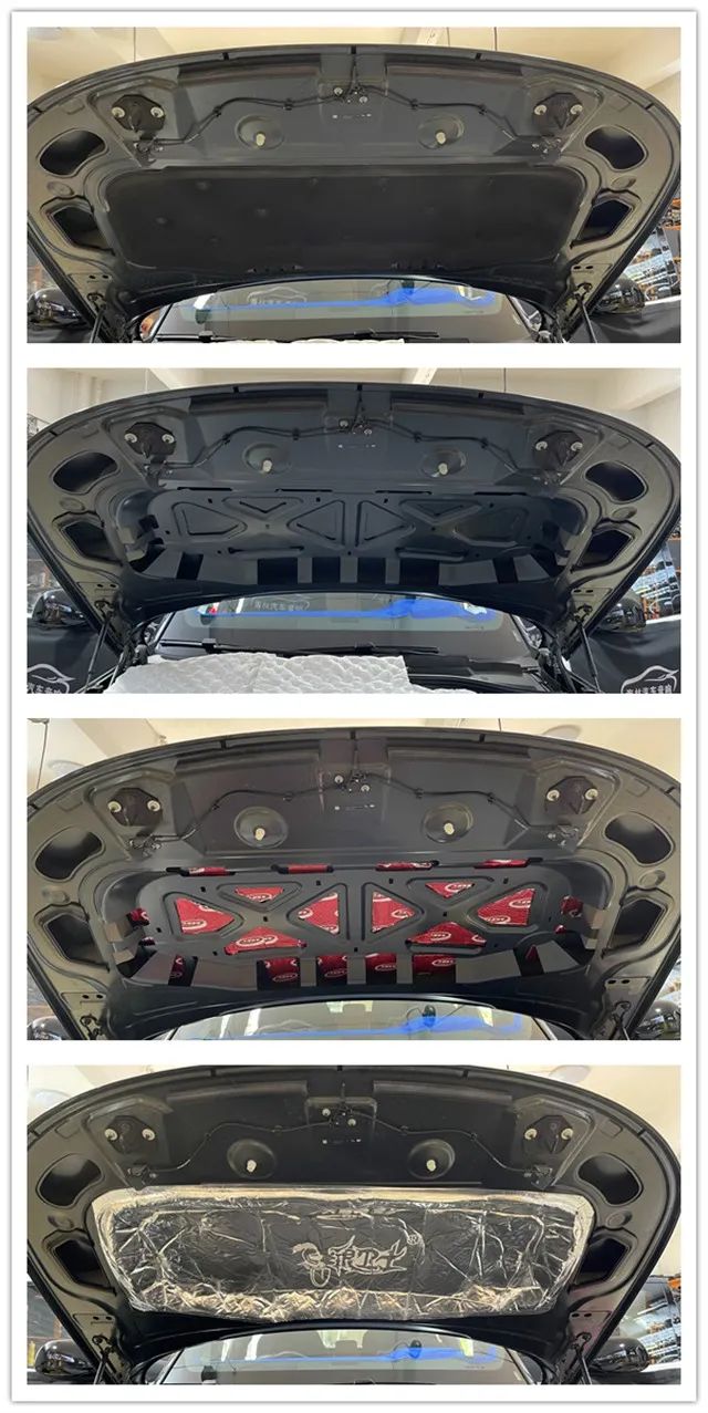改裝師使用大能紅派和大能銀衛(wèi)士對引擎蓋雙層隔音處理,有效減少噪音傳入的同時(shí),減緩引擎蓋受發(fā)動機(jī)艙熱量老化和腐蝕的速度