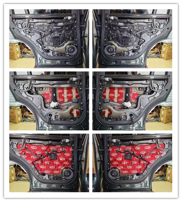 后門板隔音流程展示,雙層大能紅派隔音可以增強(qiáng)鈑金厚度,并且密封多余孔洞
