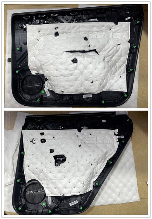 隔音改裝的關鍵在于選擇合適的隔音材料。在此次改裝中,改裝師選擇了大能隔音品牌對四門進行隔音處理。第一層采用大能紅派,具有優異的減震、隔熱、防銹以及鈑金強化性能,第二層施工則進一步提升了隔音效果,第三層配備了超級溫莎棉,有效吸收共鳴噪音,阻隔熱能,同時降低能耗。