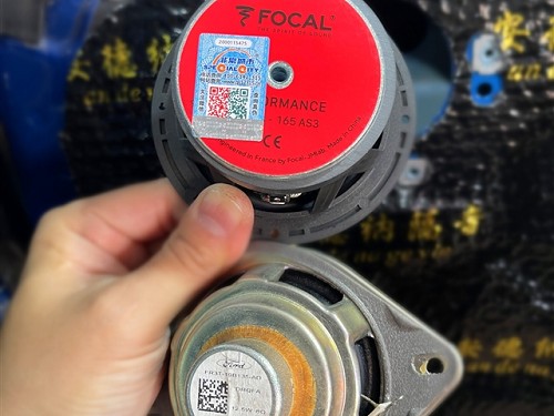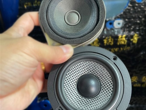 拆下來的原車中低音(上)與勁浪165AS3中低音(下)比較,可見原車喇叭用料較差,勁浪165AS3中低音音盆采用雙玻璃纖維制成,音色溫暖潤人