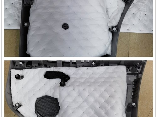 從圖中可見,原車門板較為簡陋,內部僅有一層透明塑料膜,完全沒有任何隔音措施。這種情況下,改裝音響前進行門板的隔音處理是非常必要的
