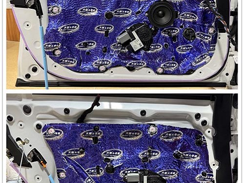 改裝師將大能藍(lán)金剛剪裁成條狀,均勻地粘貼在前后門板的內(nèi)層鈑金表面,這樣可以有效減弱金屬共振噪音