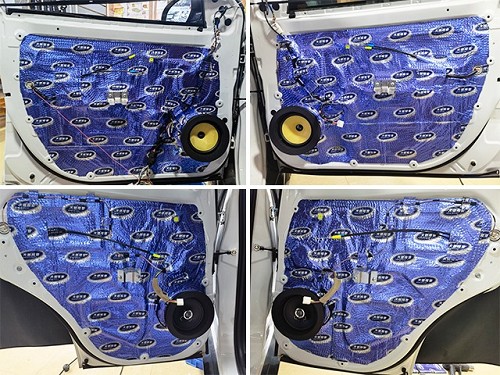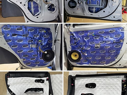 為了獲得更好的音質效果,門板隔音很有必要。將門板鈑金清理干凈后,改裝技師使用大能藍金剛+吸音棉對門板做了三層隔音處理,提高門板鈑金的剛性,減少門板共振噪音,減少路噪、風噪“入侵”的同時,將門板打造成一個密閉箱體,為聲場喇叭創造一個良好的工作環境。