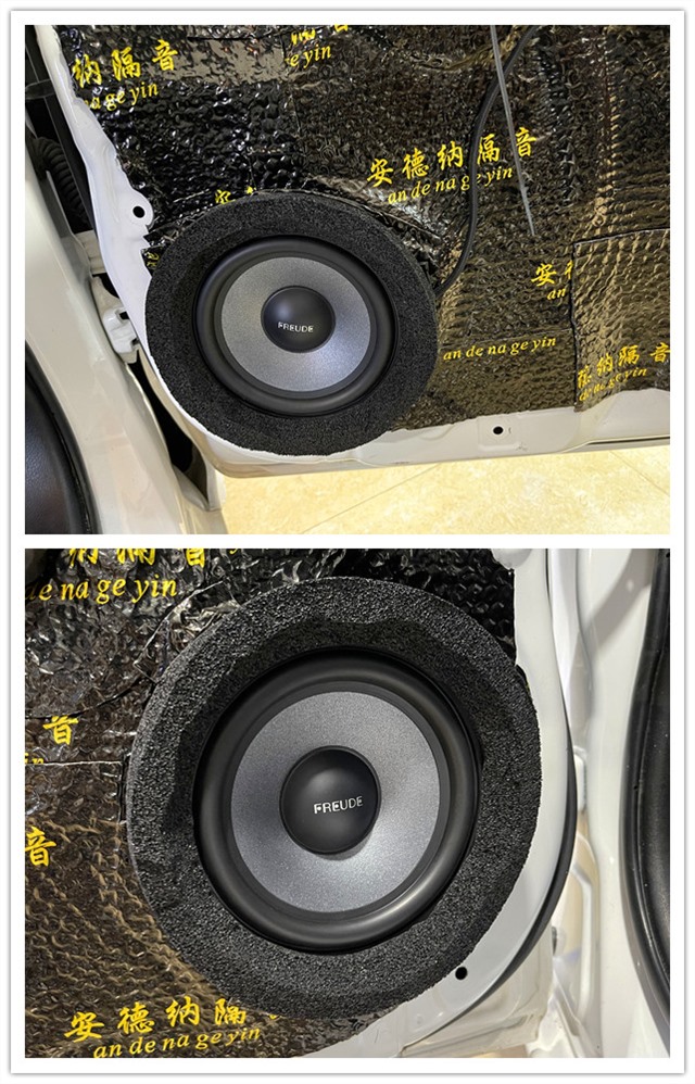 原車門板隔音措施極為欠缺,汽車行駛產(chǎn)生的風(fēng)噪會通過門板傳入車廂內(nèi)部,對音響品質(zhì)產(chǎn)生影響。因此改裝師使用安德納隔音材料對門板做了雙層隔音處理,這相當(dāng)于為聲場喇叭制作了一個箱體,讓喇叭發(fā)聲更加出色。