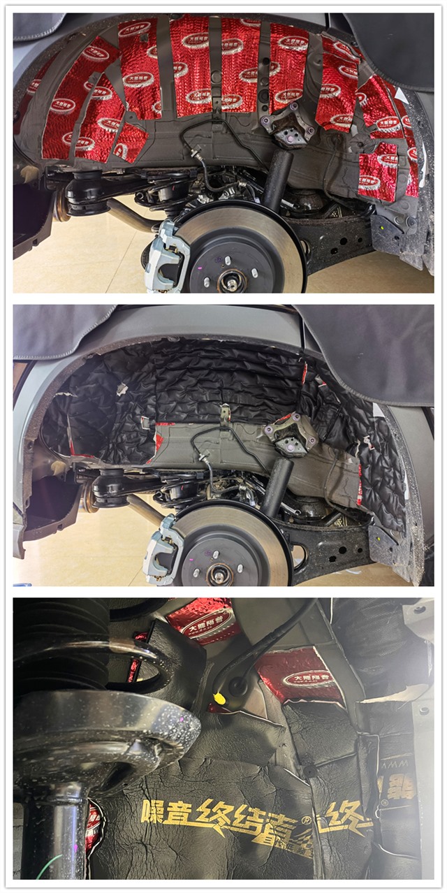 底盤和后備箱的鈑金面積較大,但原車隔音十分簡單,所以底盤和后備箱很容易產生共振和共鳴噪聲。因此我們的改裝師使用大能紅派及噪音終結者對底盤做了雙層的隔音處理,在減少共振噪聲的同時,還有效的增強了鈑金的剛性。后備箱、輪轂也進行雙層隔音,有效降低備胎窩空腔共鳴噪音。