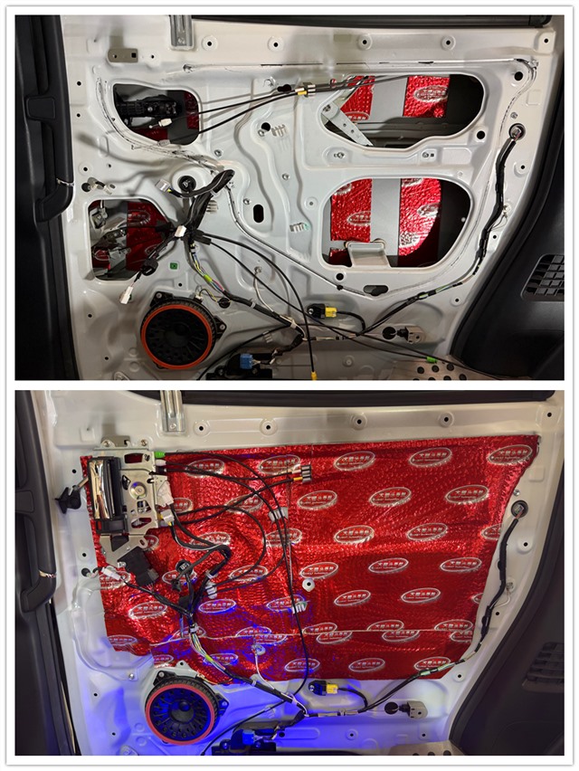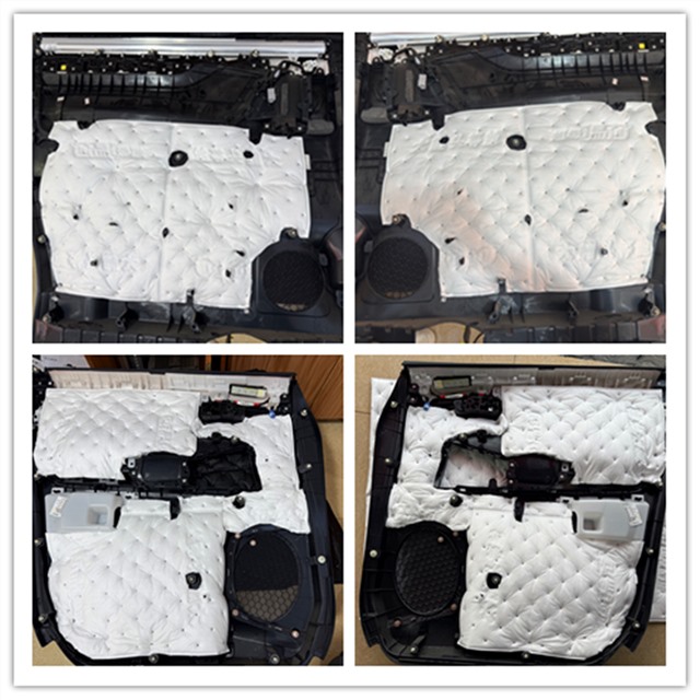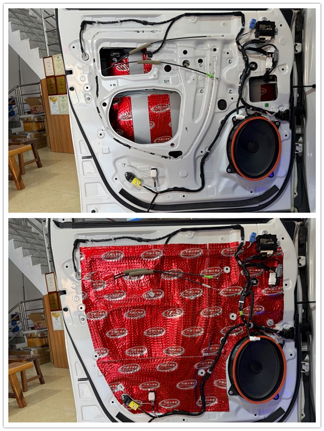 門板最容易受到外界噪音的影響,像風噪和共振,大多就是通過這里傳進來的。為了改善這一情況,改裝師先在門板貼上雙層大能紅派隔音材料。強化鈑金結構,減少因震動帶來的噪音。接著,又在門板飾蓋上粘貼一層大能溫莎吸音棉。這種吸音棉是用柔軟而高密度的材料制成的,能有效吸收中高頻的雜音。兩種材料搭配使用,能大大提升門板的隔音效果,讓車內環境更加安靜、舒適。