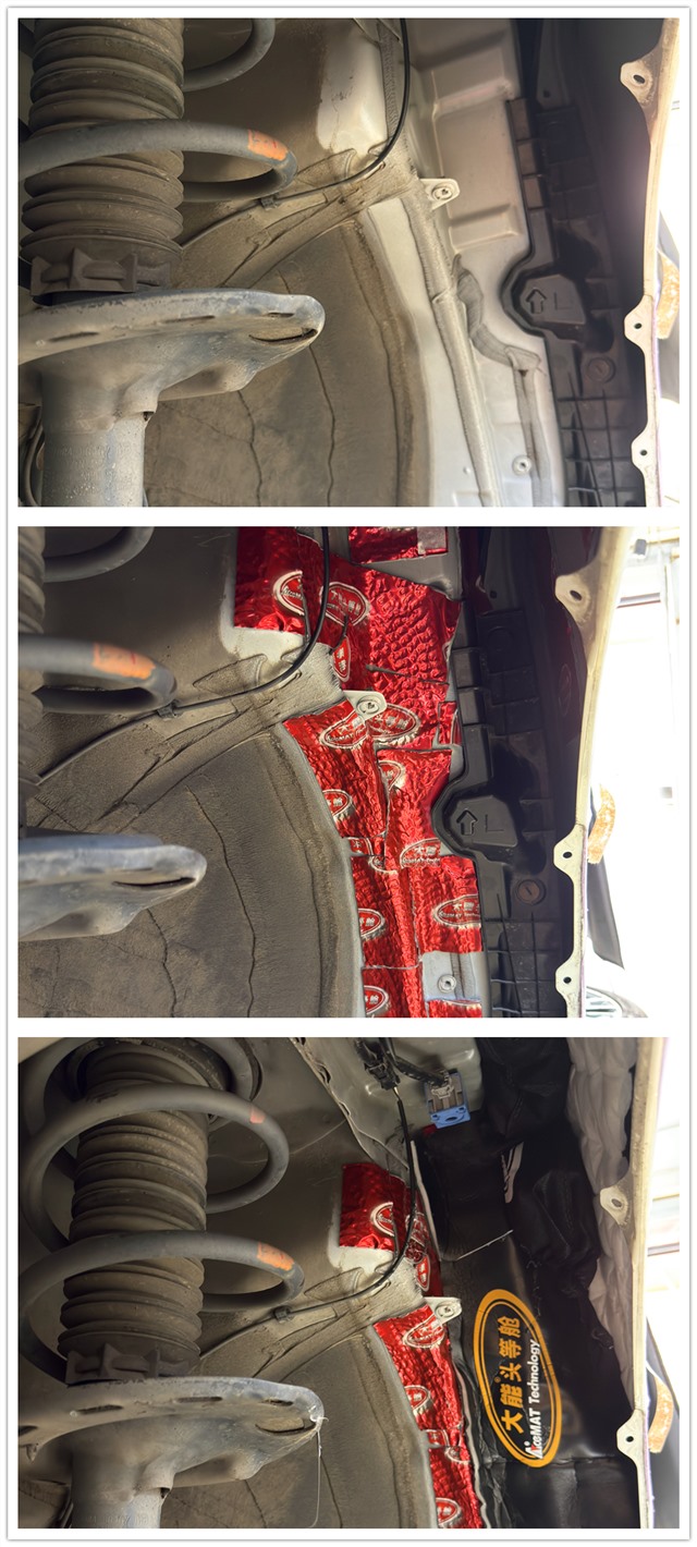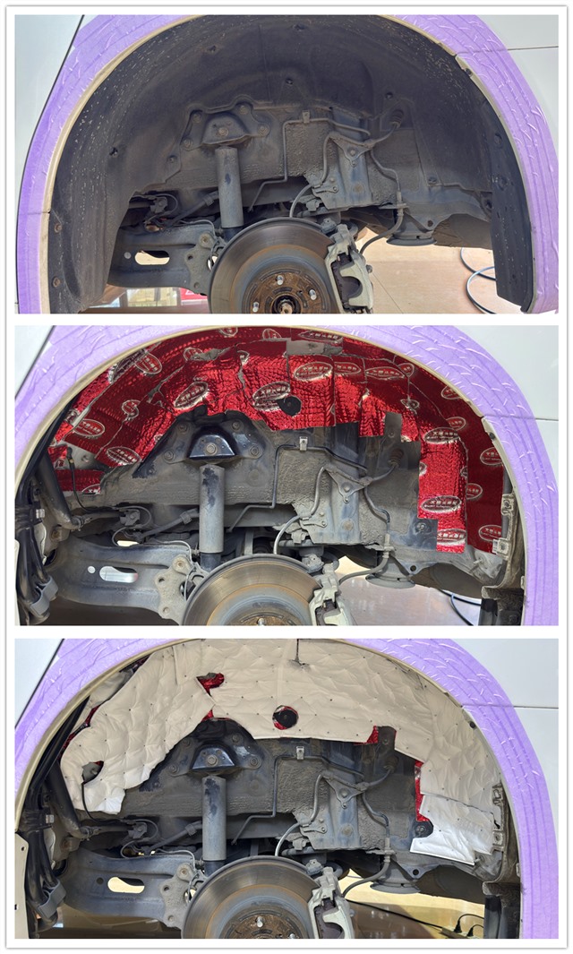 汽車在高速行駛或經過路面粗糙時,胎噪更為明顯。為有效降低胎噪,改裝師在四個輪弧內側貼合了大能隔音材料?梢栽鰪娸喕〗Y構的剛性,從而有效抑制共振和滾動噪音的傳入。在安裝過程中,根據每個輪腔的曲面結構,精細裁剪并彎折材料,使其嚴密貼合鈑金表面,確保無空鼓、無翹邊,最大限度發揮材料的隔音減震效果。
