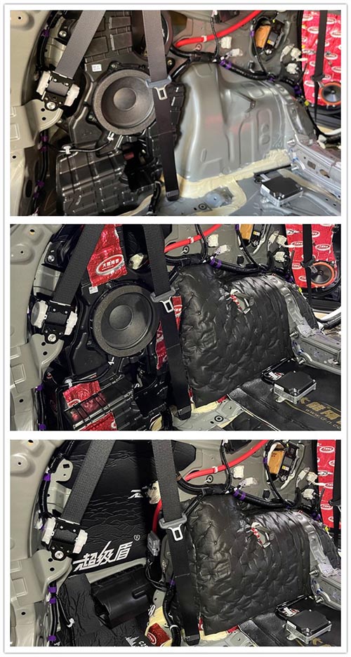 底盤和后備箱的鈑金面積較大,但原車隔音措施簡單,因此容易產生共振和共鳴噪聲。改裝師使用大能紅派及噪音終結者對底盤做了雙層隔音處理,減少共振噪聲的同時,還有效增強了鈑金的剛性。后備箱、后輪轂也進行了雙層隔音,有效降低備胎窩空腔共鳴噪音。