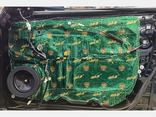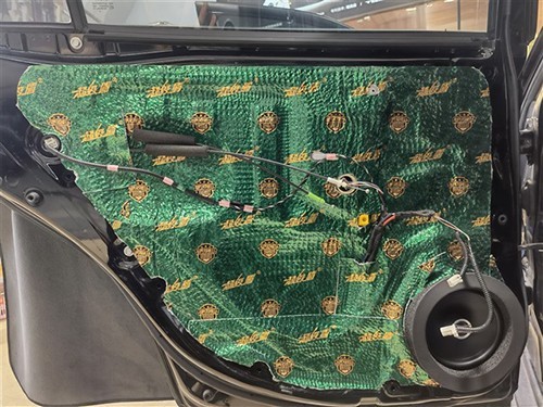 銳志原車門板內部只有一層塑料薄膜,撕掉后會看到十分空洞的鈑金結構,難以起到良好隔音效果。海林改裝技師使用大能超級盾隔音材料,對門板內層做第一層止震處理,降低門板自身共振噪聲;對門板做第二層做密封處理;飾蓋滿貼吸音棉,用料十足。三層隔音形成一個隔音箱的作用,完美把風噪擋在門外,給車內一個安靜的聽音樂環境。